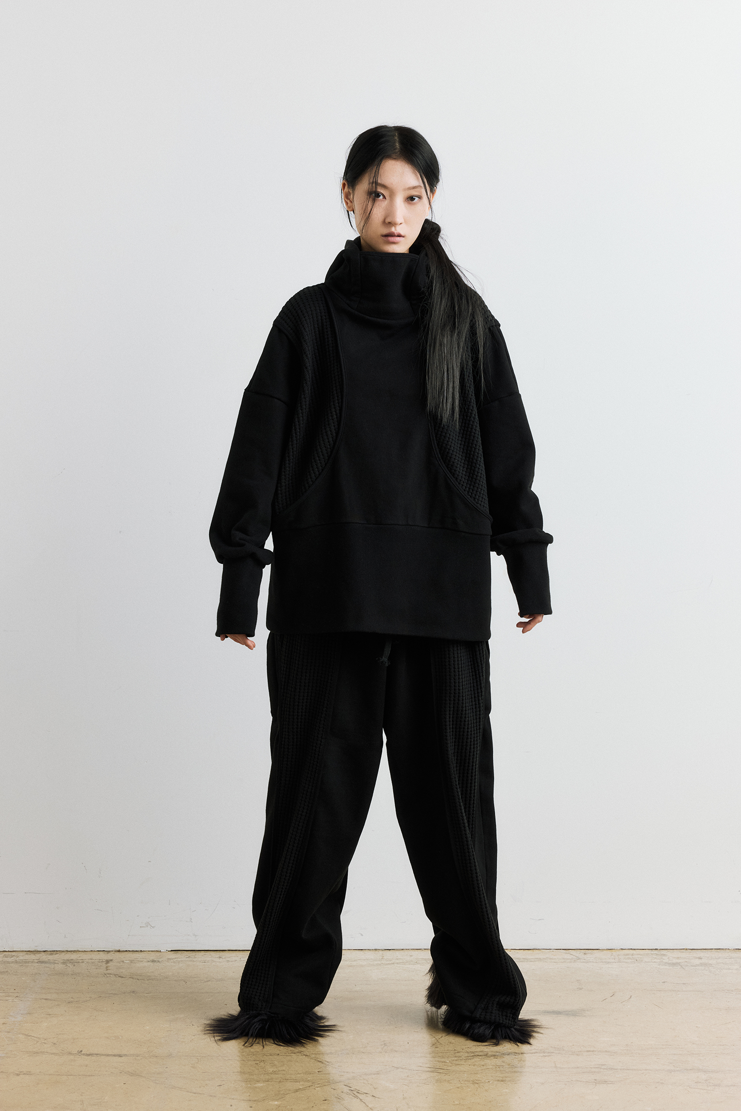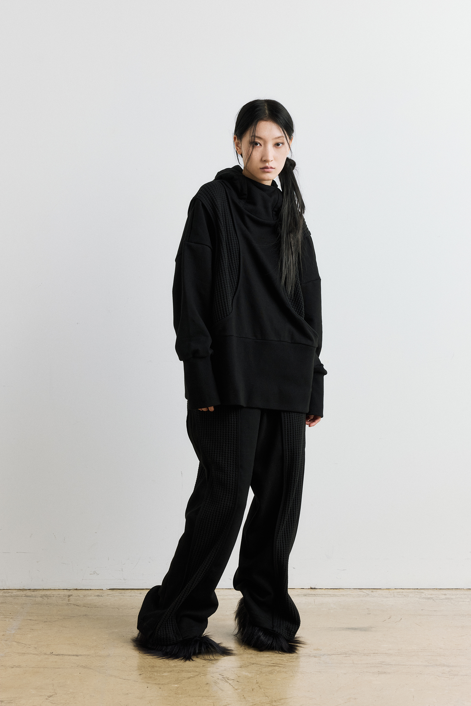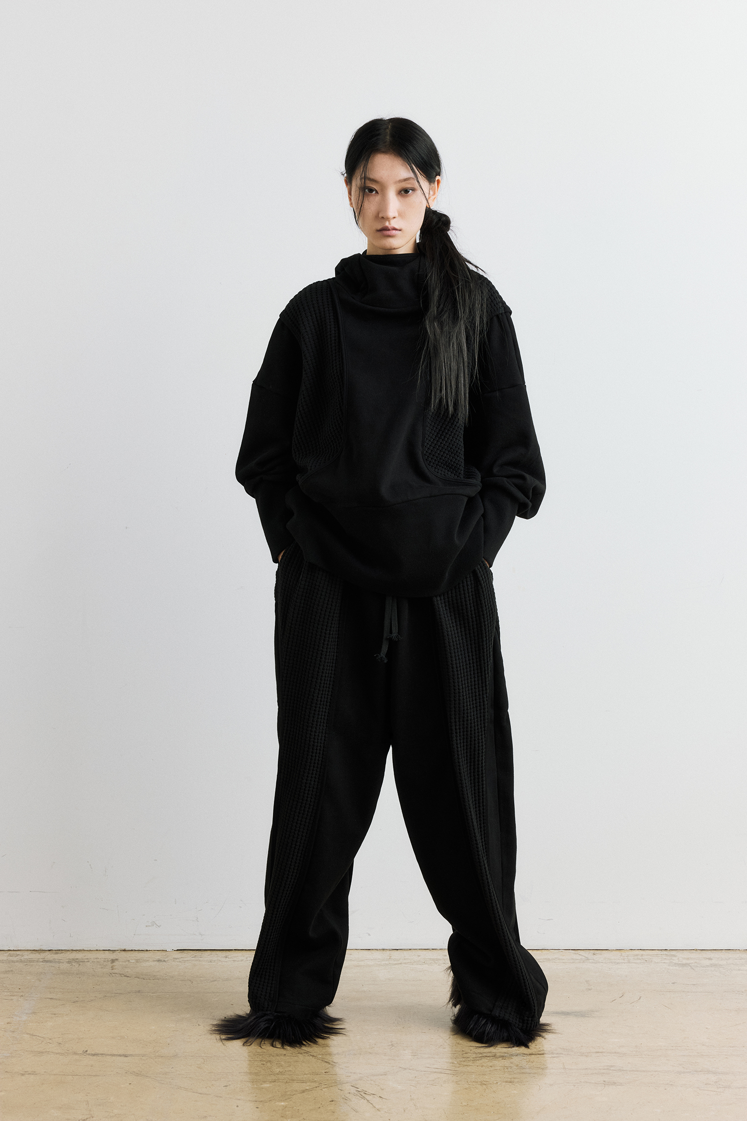 Trousers that stand out in incision. Waistband, adjustable waistband, and hem strap. Cotton taping.