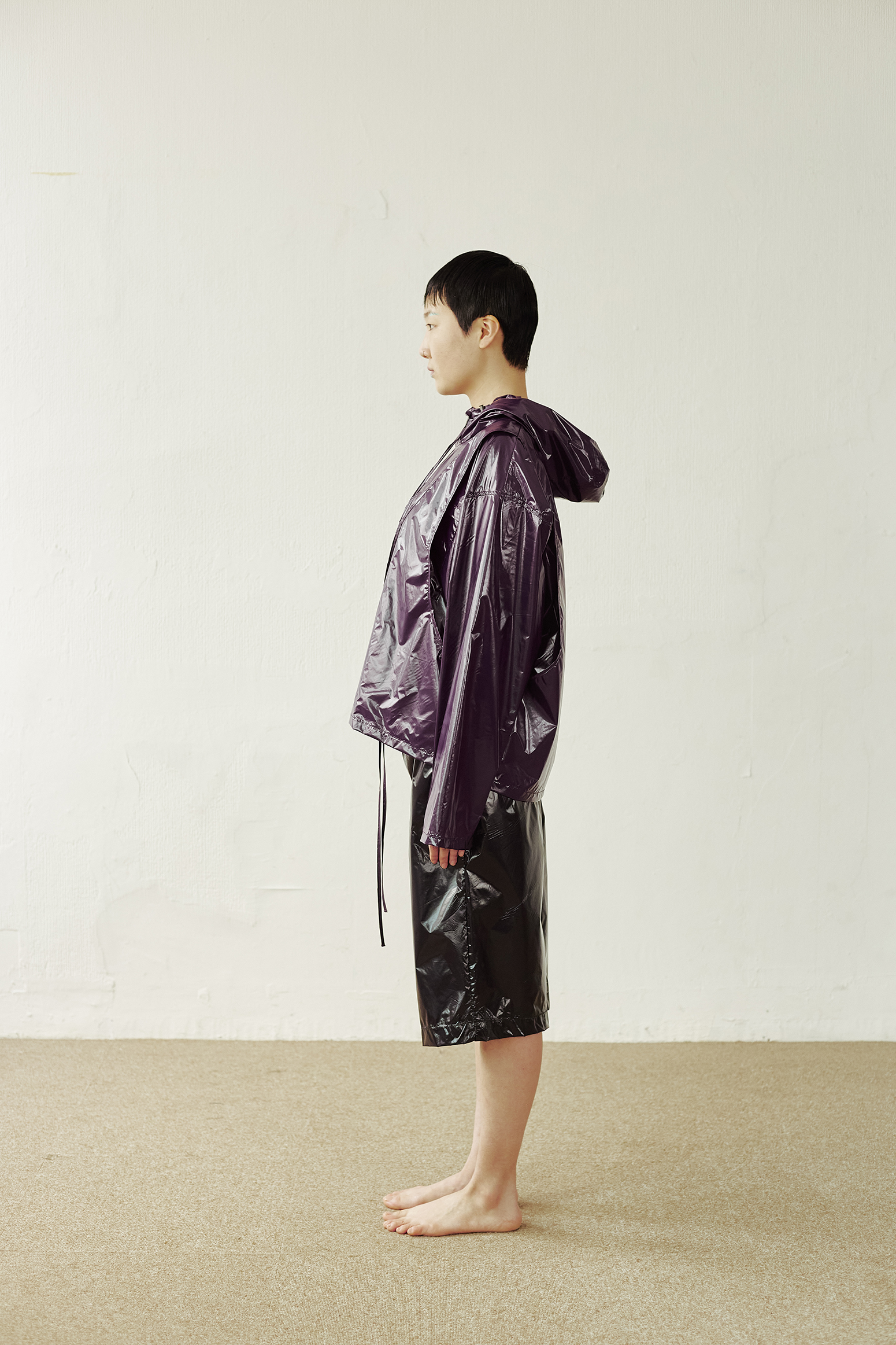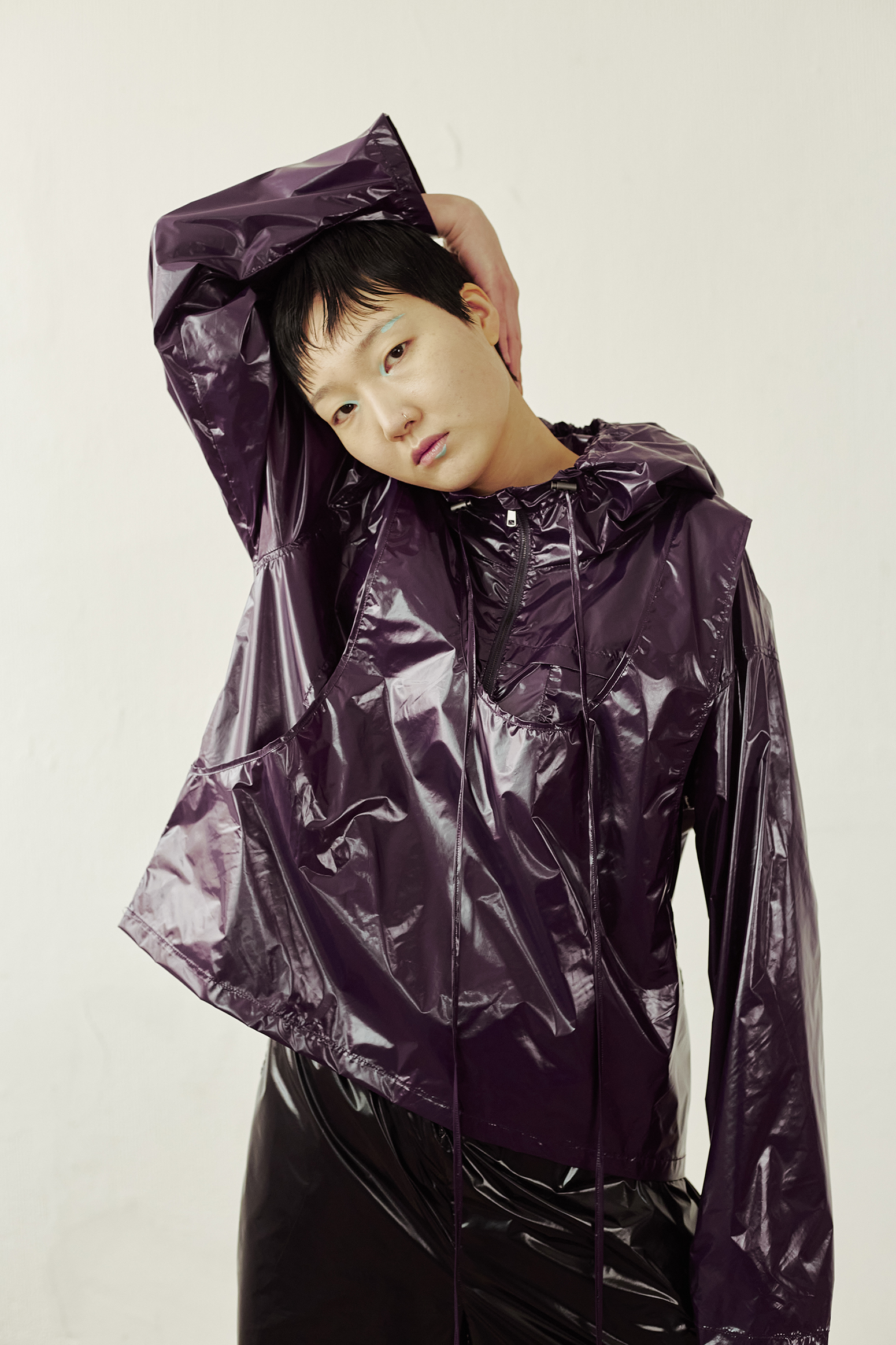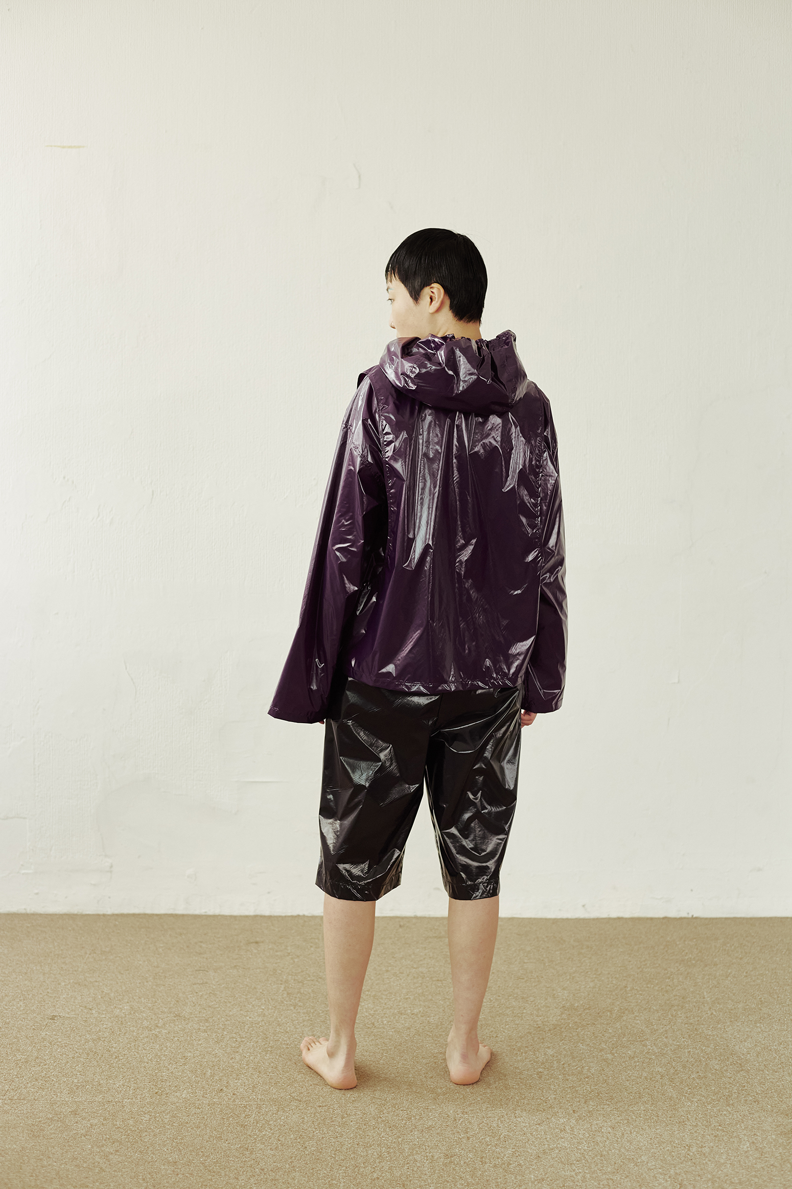 글로시함이 돋보이는 소재감과 바람막이 정도의 두께. 와이드한 후드와 조절이 가능한 아일렛과 끈. 상단부 지퍼. 가슴팍에 위치한 포켓. 천을 겹친 듯한 슬리브리스 디테일.