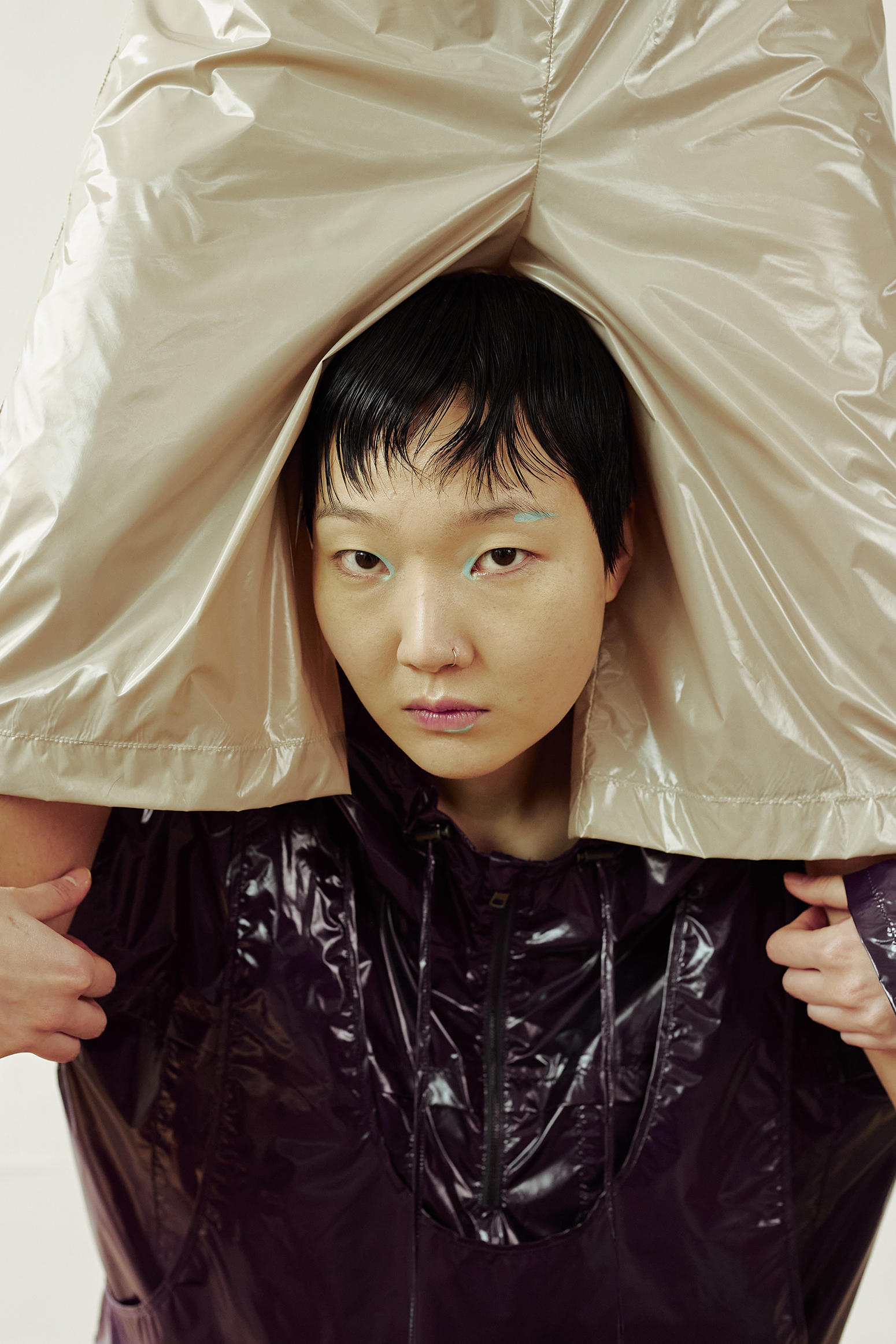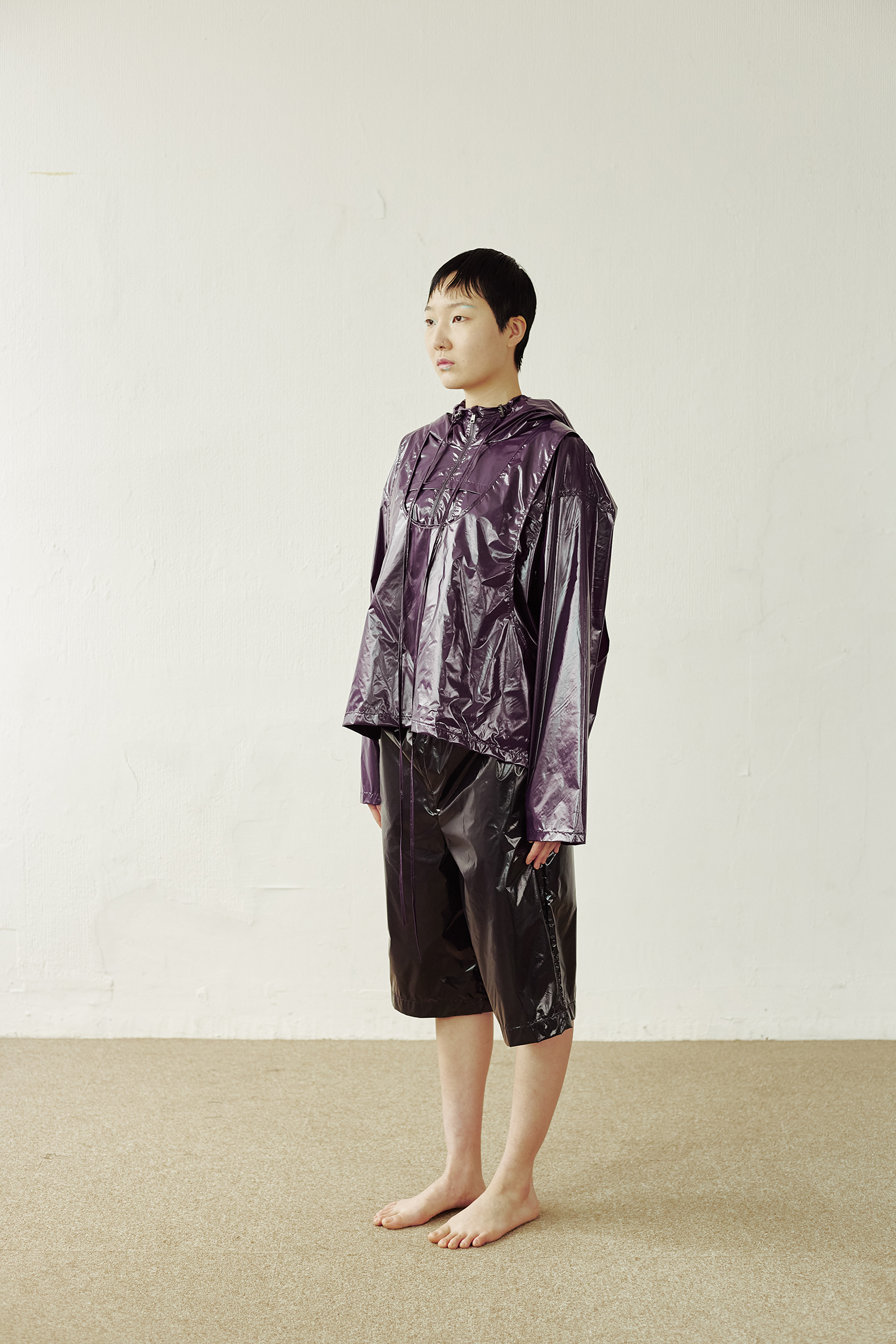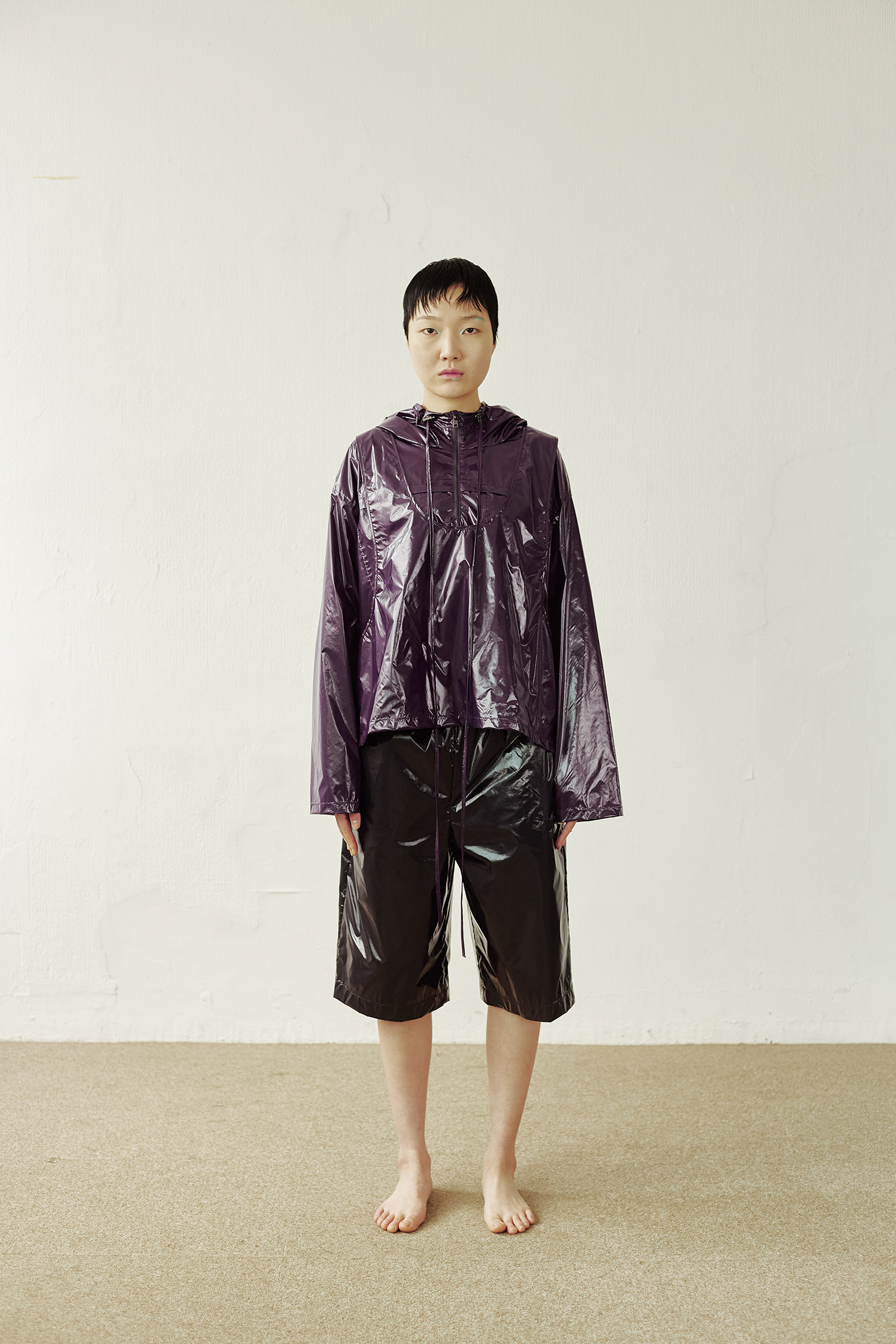 글로시함이 돋보이는 소재감과 바람막이 정도의 두께. 와이드한 후드와 조절이 가능한 아일렛과 끈. 상단부 지퍼. 가슴팍에 위치한 포켓. 천을 겹친 듯한 슬리브리스 디테일.